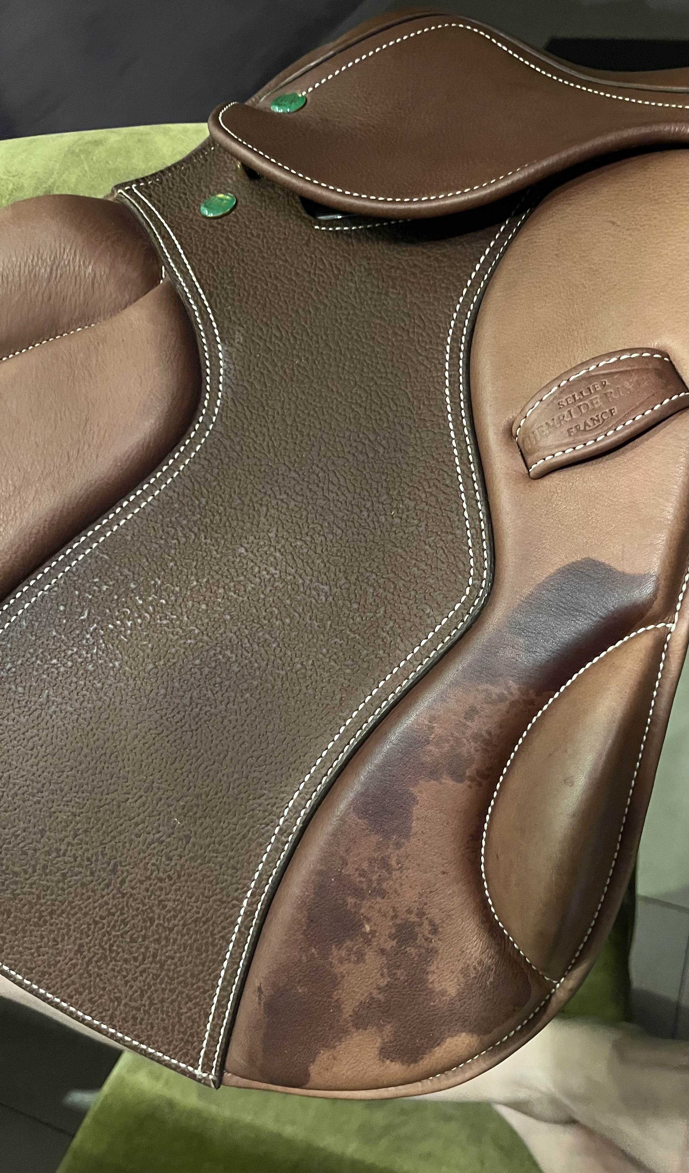 Hi, thank you for reaching out to us. Could you kindly confirm if you applied oil to the Henri de Rivel Carmel Covered Close Contact Jumping Saddle, as depicted in the picture with the stain? If so, we recommend gently using a hot gun over the stains for a couple of minutes to facilitate oil absorption. Alternatively, placing the saddle in direct sunlight for a few hours can ensure the oil is fully absorbed. Be sure to monitor closely to prevent any heat damage. Please let us know if you have any further questions or need additional assistance!