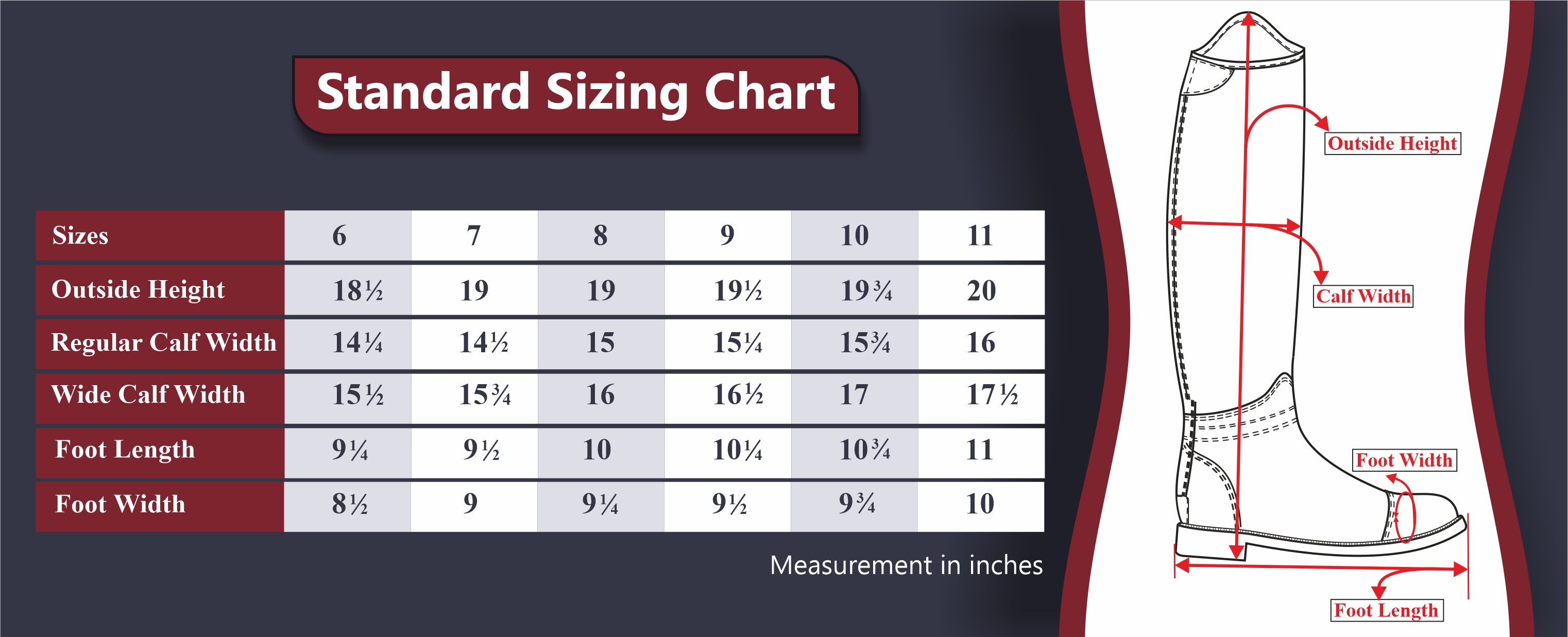 Hello, we have attached the size chart for the TuffRider Ladies Arctic Fleece Lined Winter Riding Boots. These boots are designed for optimal warmth and comfort during cold weather rides, ensuring a perfect fit to keep your feet cozy and protected from the elements.